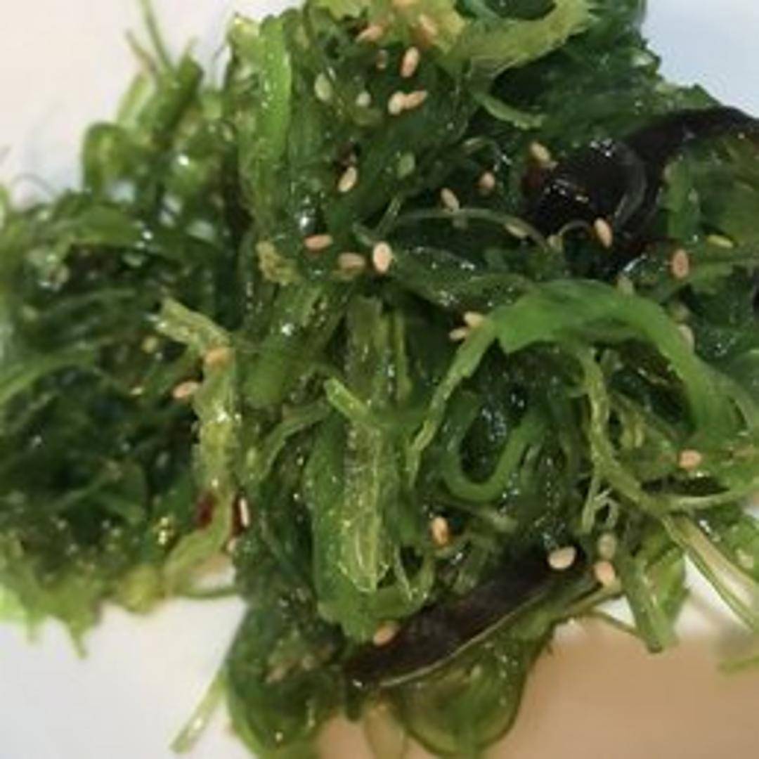 A refreshing salad featuring marinated seaweed, often with sesame seeds and a light, tangy dressing.