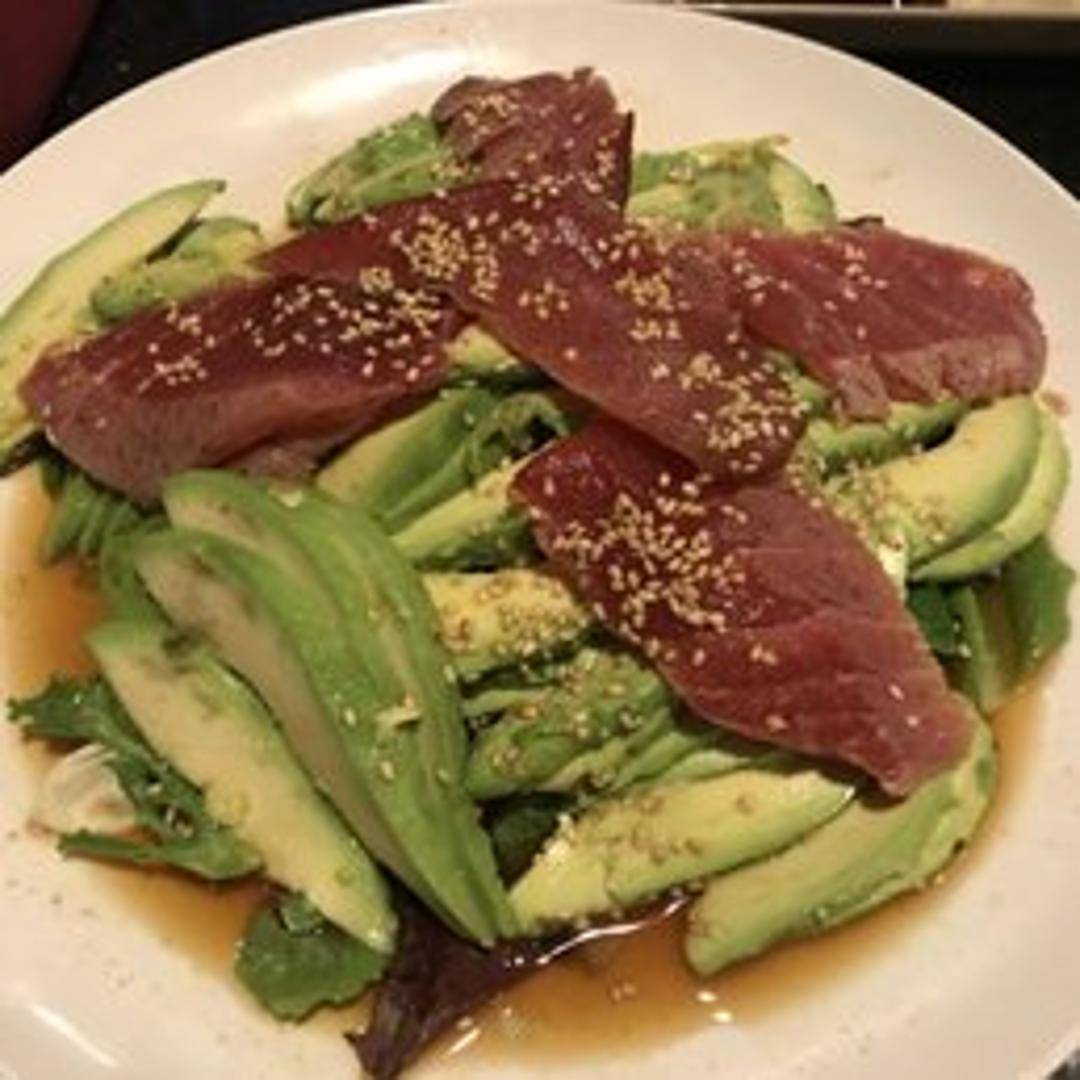 Fresh avocado slices served on a bed of greens with a light dressing.