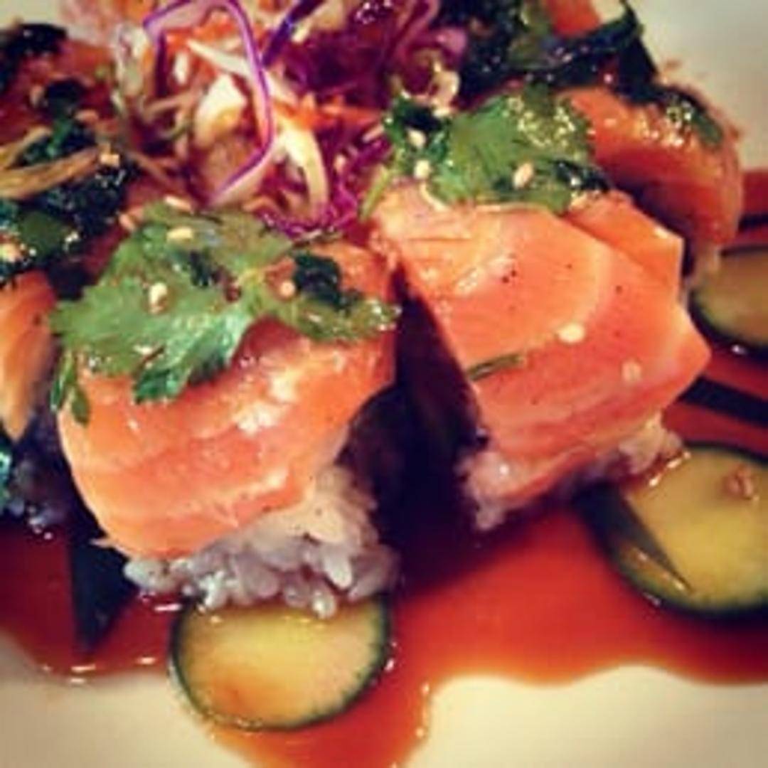 Salmon and rice rolled in nori seaweed.