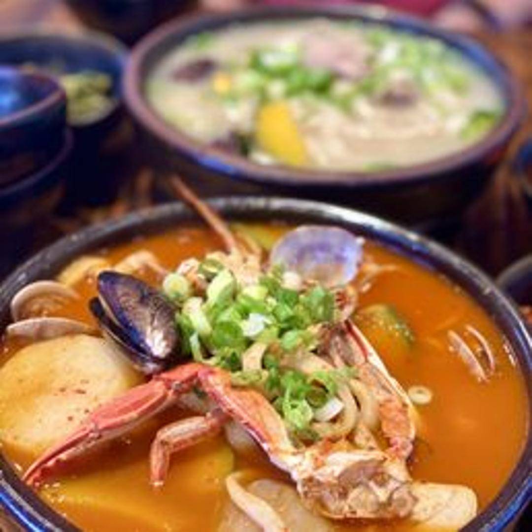 Hand-cut, knife-shaved wheat flour noodles in a rich and spicy seafood broth. Includes a generous mix of fresh seafood such as shrimp, clams, mussels, and squid. Garnished with vegetables and a sprinkle of seaweed.