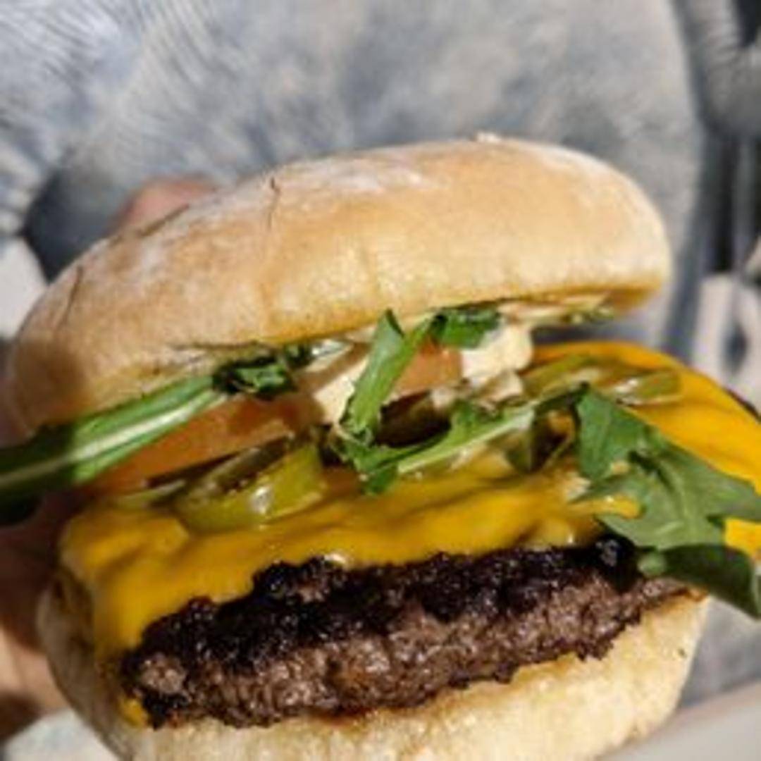 A spicy and bold burger featuring a flame-grilled beef patty, topped with melted pepper jack cheese, jalapeños, crispy fried onions, and a fiery chipotle sauce, served on a toasted pretzel bun.