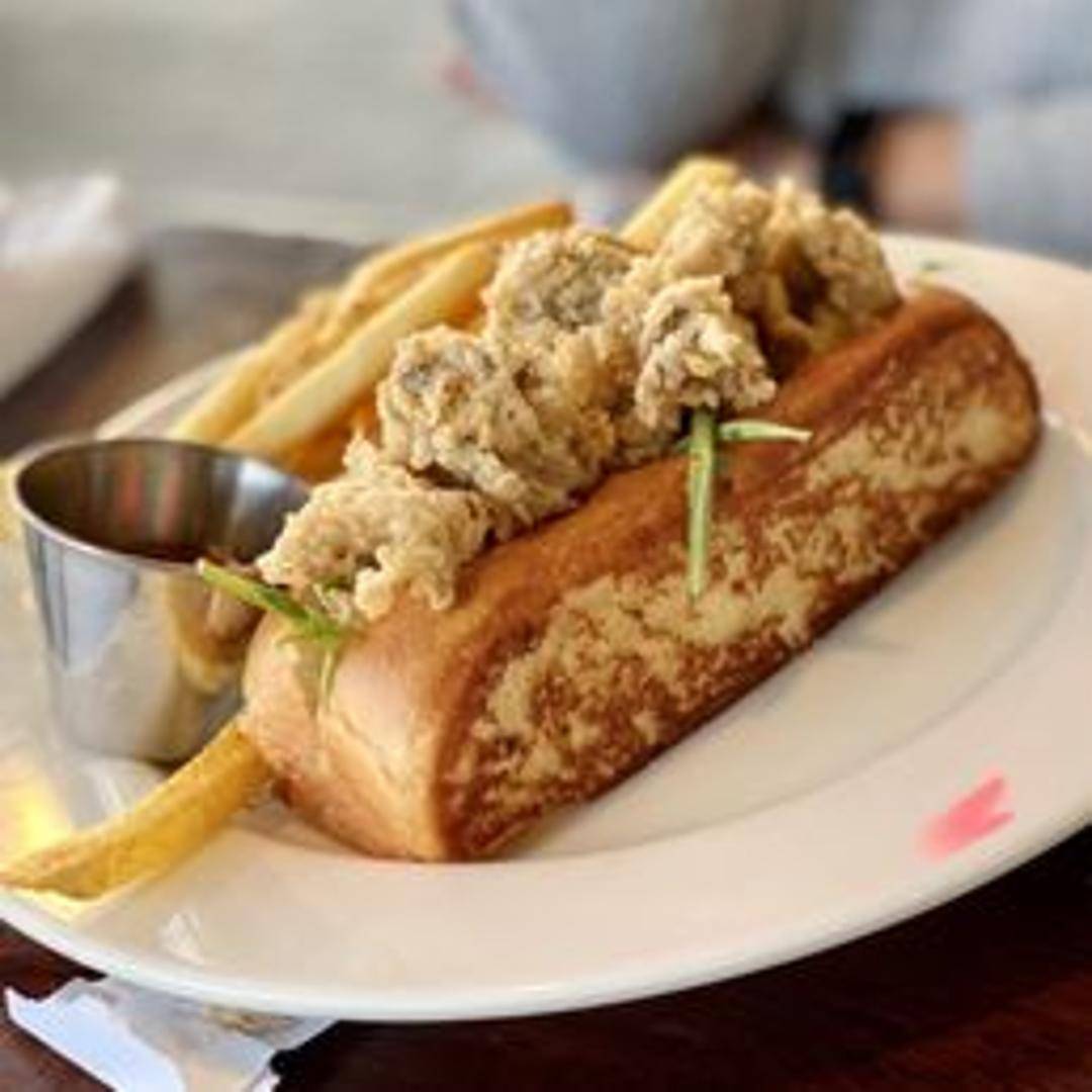 A classic Louisiana-style sandwich featuring a generous portion of crispy, golden-fried oysters piled high on a crusty baguette or French bread. Dressed traditionally with shredded lettuce, ripe tomatoes, crisp pickles, and a slathering of tangy remoulade, creating a harmonious blend of textures and flavors.