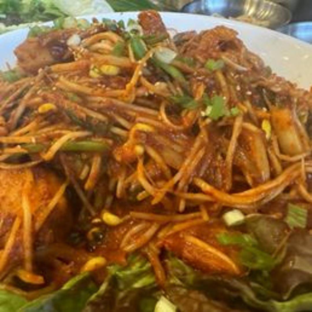 Steamed monkfish, often prepared with vegetables and a flavorful sauce. The fish is known for its firm, meaty texture and mild flavor, allowing the sauce to shine.