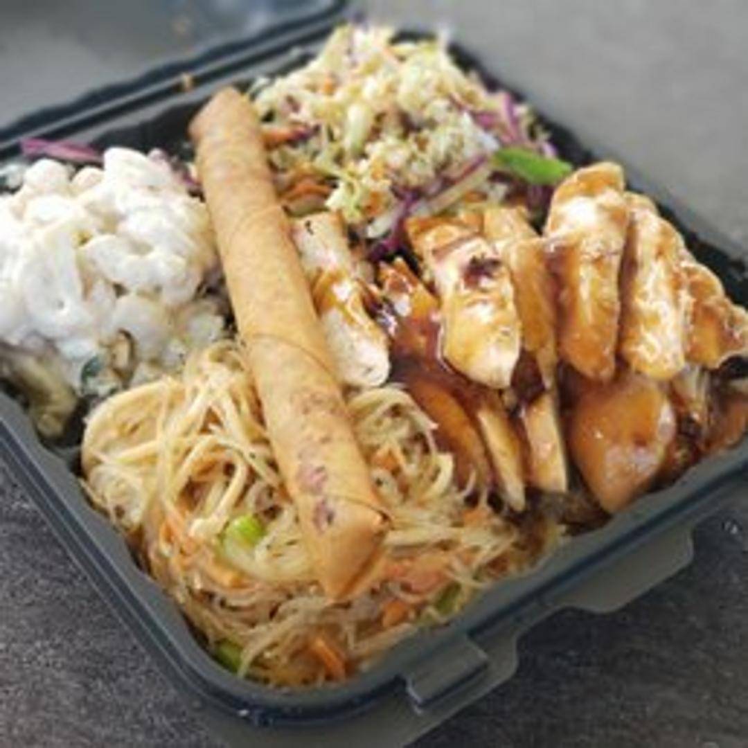 A traditional Hawaiian feast featuring kalua pig (slow-roasted pork), lomi salmon (diced salmon with tomatoes and onions), poi, and your choice of rice or mac salad. A taste of authentic island cuisine.