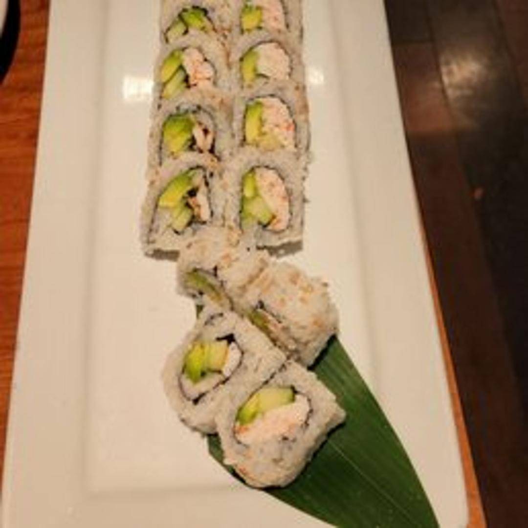 Crab, avocado, and cucumber rolled in sushi rice and nori seaweed, often topped with sesame seeds.