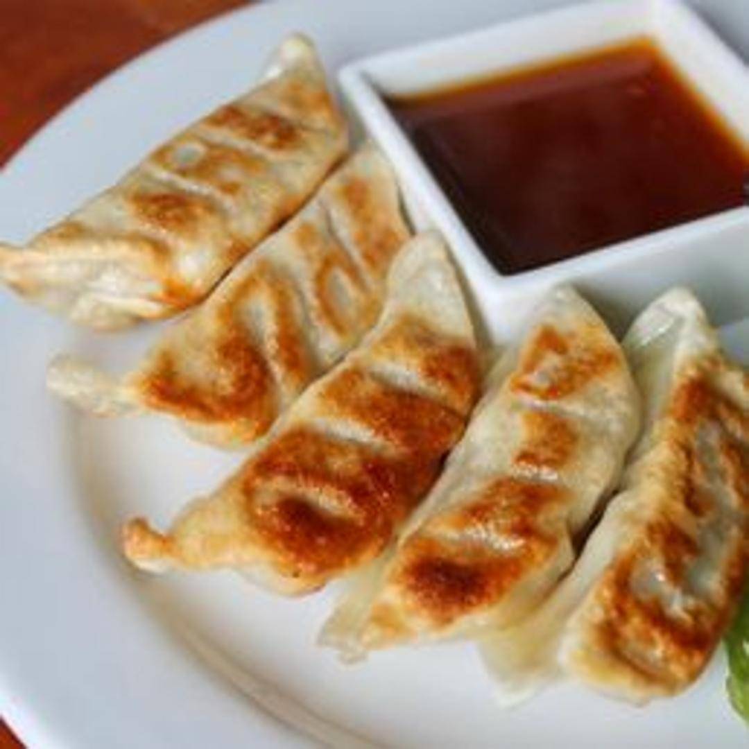 Pan-fried pork dumplings served with a soy dipping sauce.