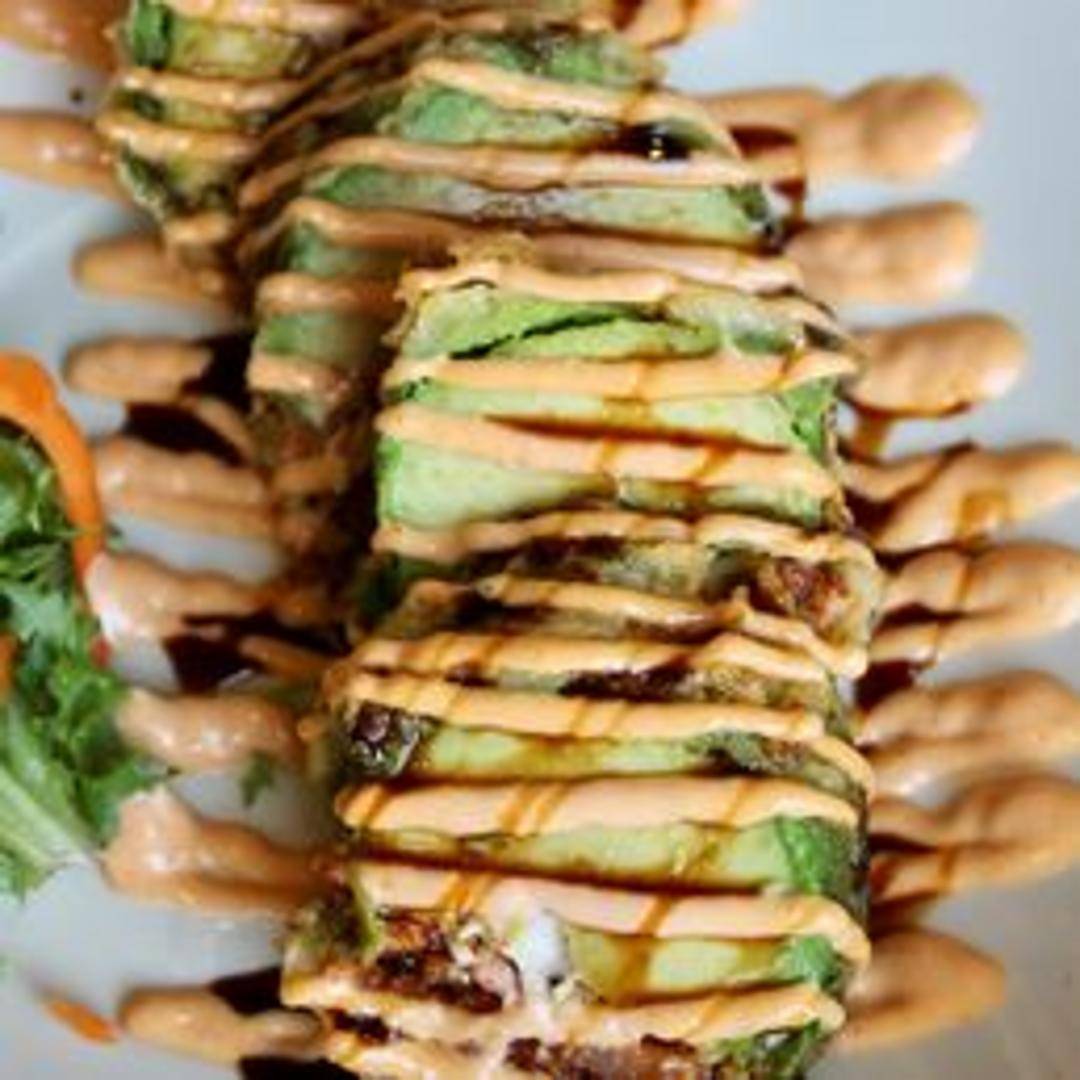 Tempura-fried avocado topped with spicy tuna, crab mix, and eel sauce.
