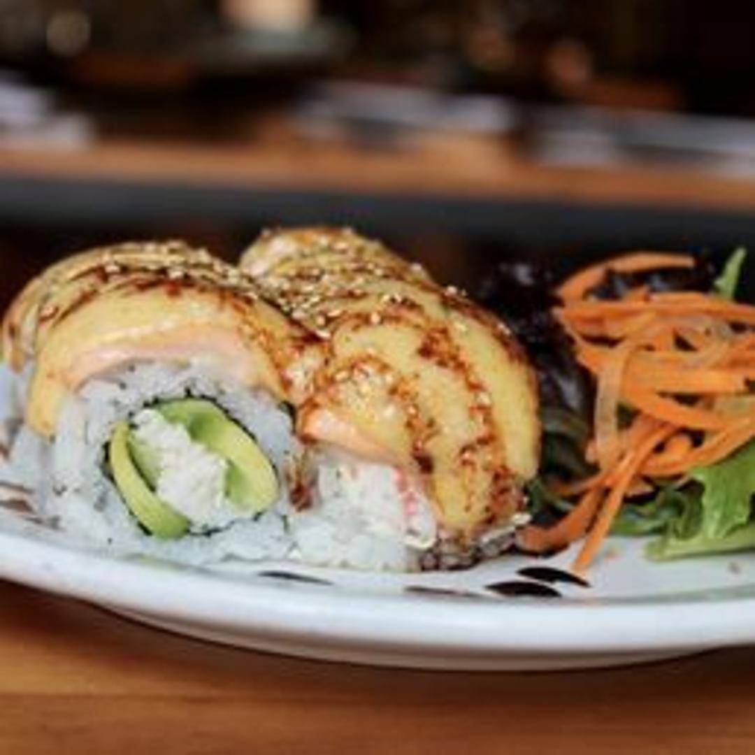 Crab mix and avocado topped with baked scallops, mozzarella cheese, and eel sauce.