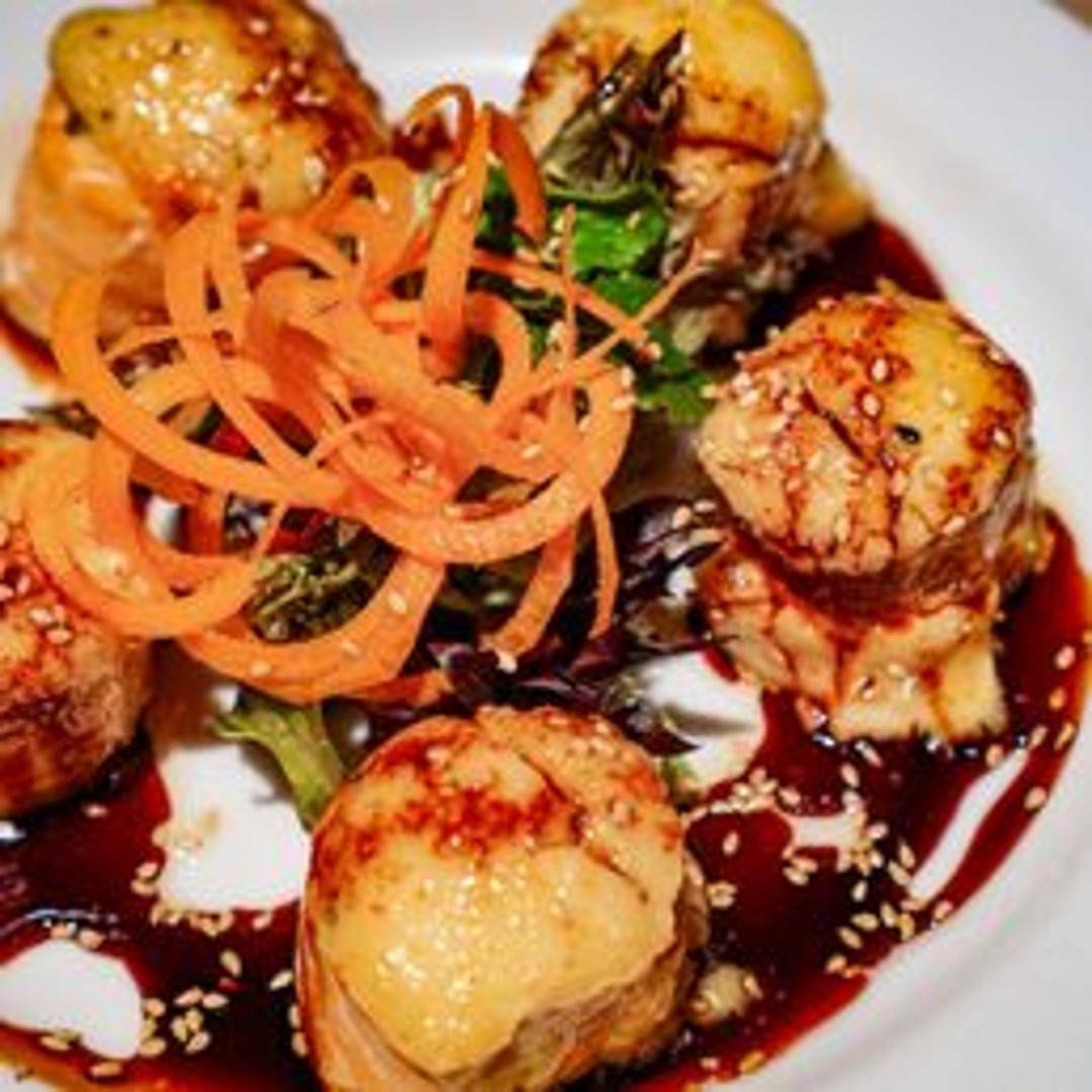 Tempura-fried shiitake mushrooms stuffed with spicy tuna and cream cheese, topped with eel sauce and sesame seeds.