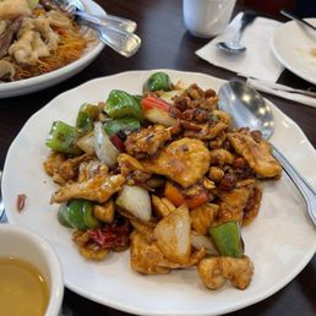 Diced chicken stir-fried with peanuts, vegetables, and chili peppers in a savory and slightly spicy Kung Pao sauce.