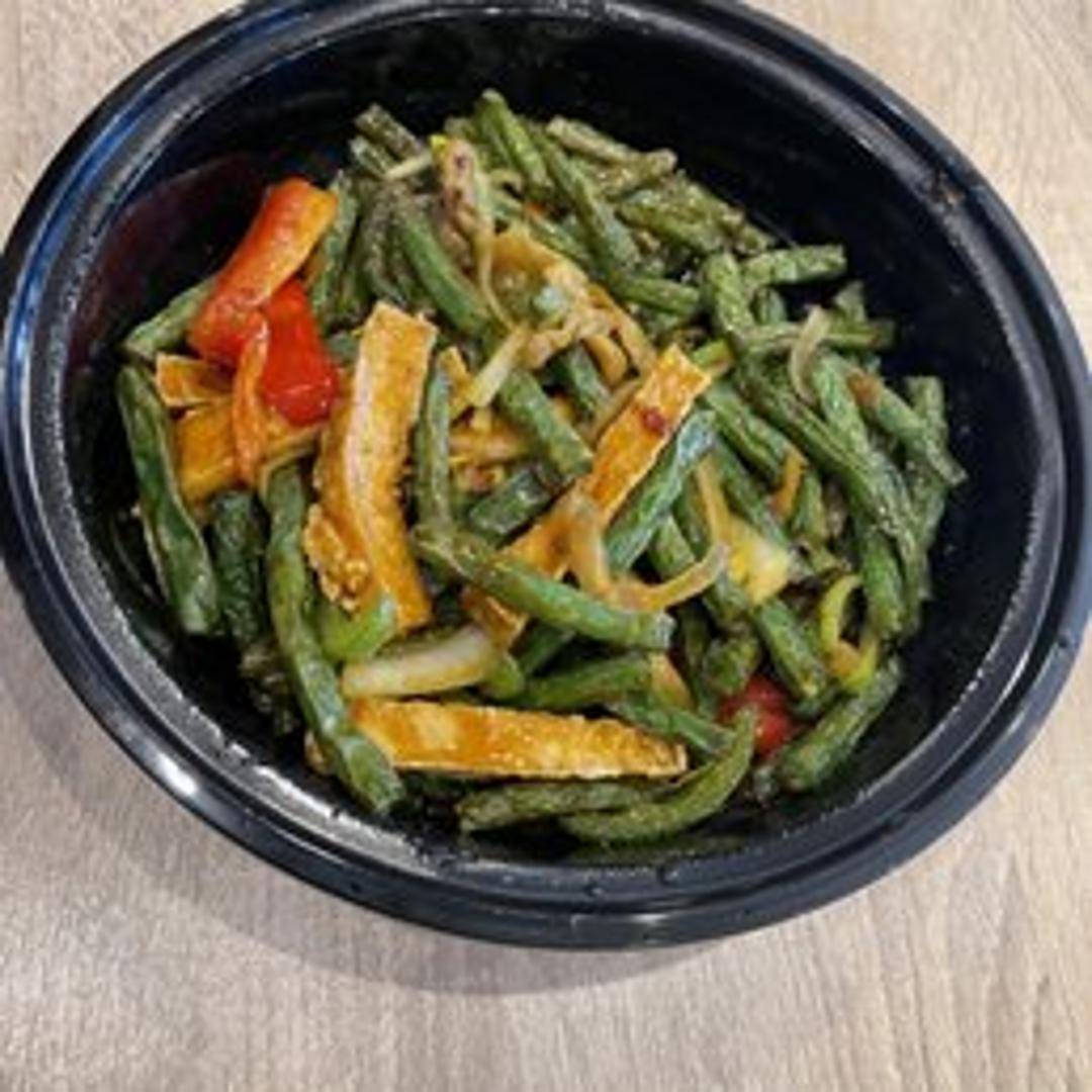 Fresh green beans stir-fried with tofu, garlic, and a savory sauce. A light and flavorful vegetarian option.