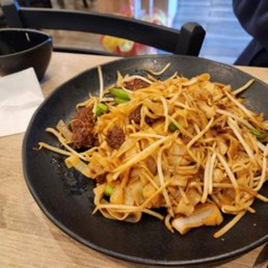 A classic Cantonese stir-fried noodle dish featuring wide, flat rice noodles (chow fun) stir-fried with tender slices of beef, bean sprouts, scallions, and often onions. The dish is typically seasoned with soy sauce, oyster sauce, and sesame oil, resulting in a savory and slightly sweet flavor with a slightly smoky char from the wok.