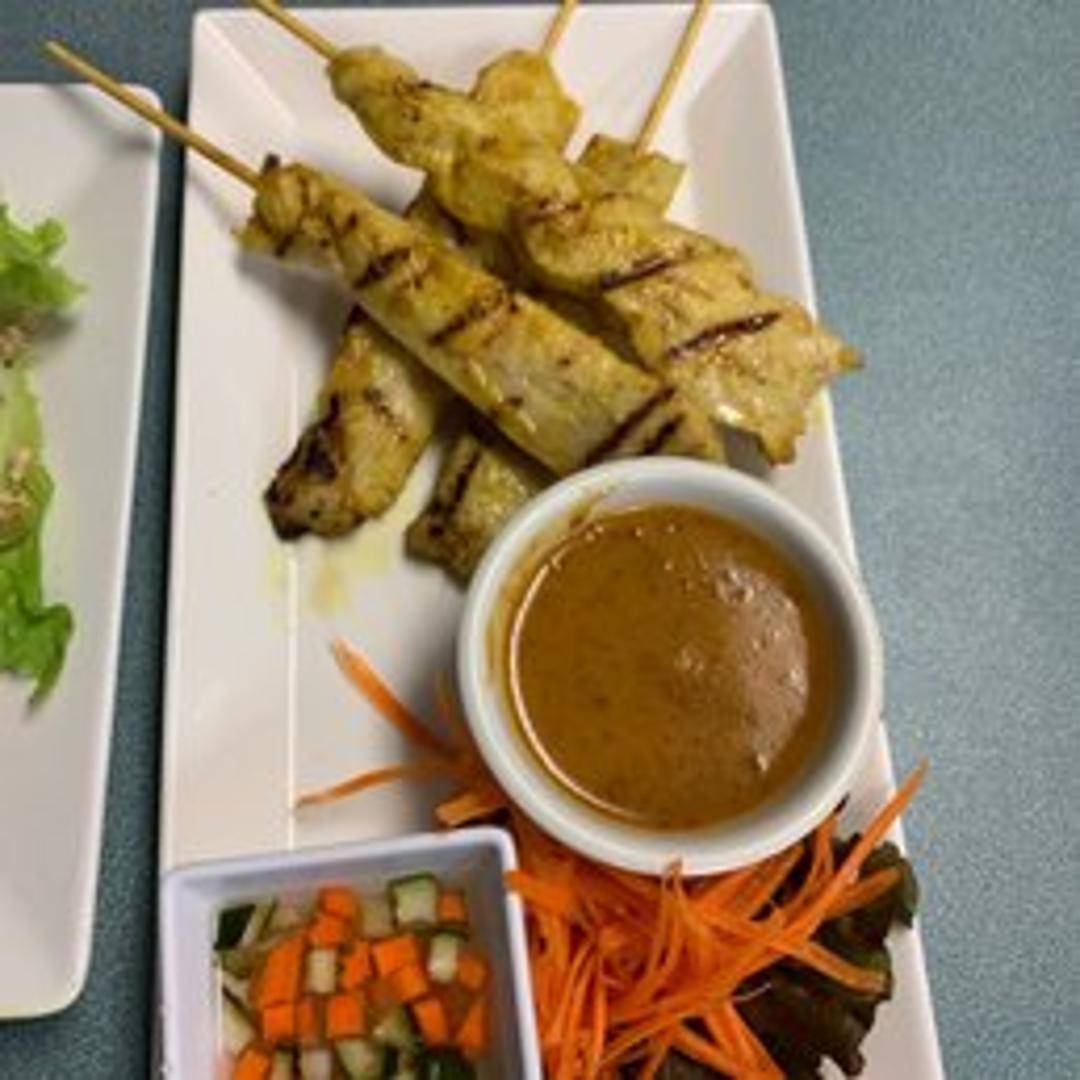 Savor our exquisitely prepared Chicken Satay, featuring three skewers of tender chicken breast marinated in a rich blend of aromatic spices and coconut milk. Grilled to perfection, these flavorful skewers are served alongside a creamy, homemade peanut dipping sauce and a refreshing cucumber relish (Ajaad) for a delightful culinary experience.
