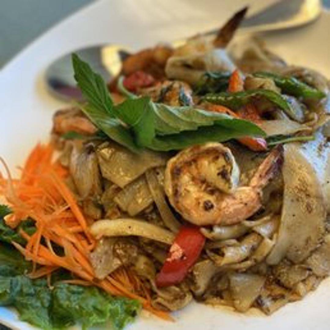 A flavorful and spicy stir-fried noodle dish (Pad Kee Mao) featuring wide rice noodles, fresh basil leaves, bell peppers, onions, and your choice of protein, all tossed in a savory, spicy sauce. Known for its bold flavors and aromatic herbs, offering a satisfying kick.