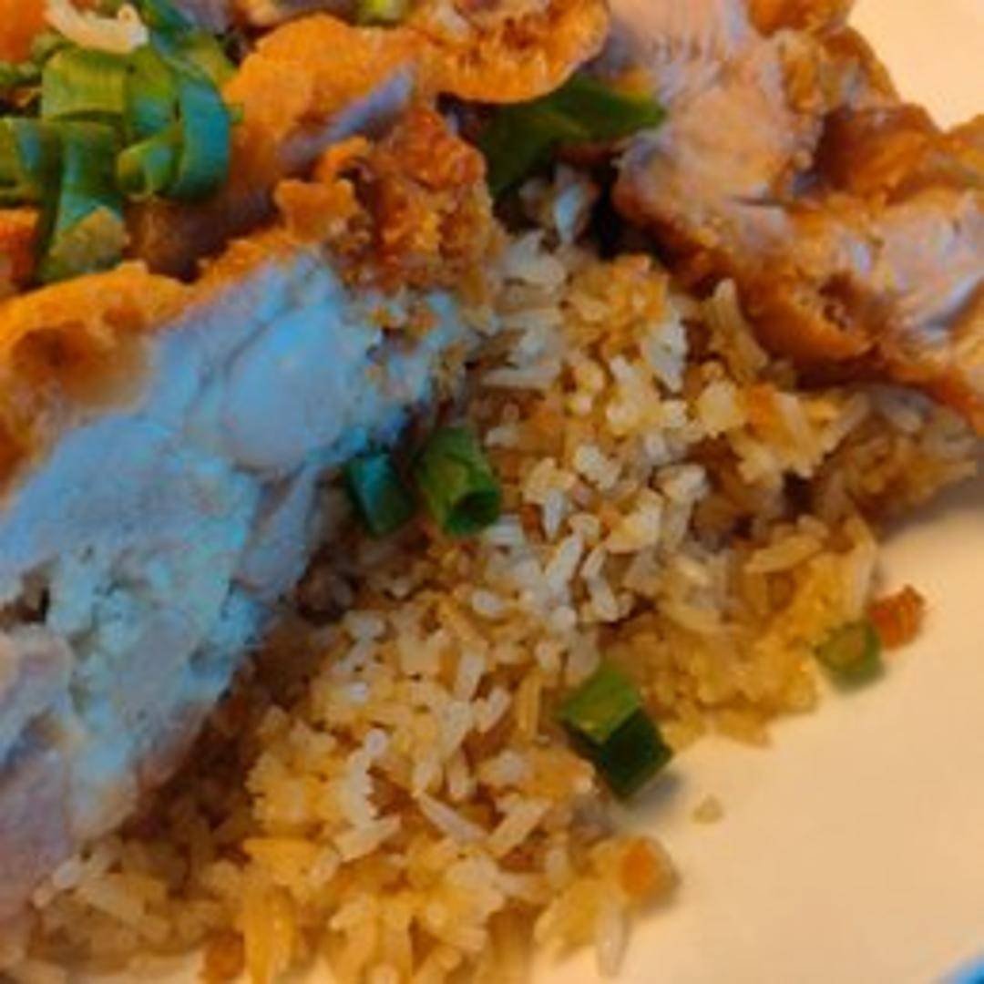 Experience a popular Thai street food sensation with 'Khao Mun Kai Tod'. This dish features deliciously crispy fried chicken (kai tod) served atop fragrant rice cooked in savory chicken broth and infused with ginger (khao mun). It's typically accompanied by a vibrant, tangy, and spicy dipping sauce, creating a perfectly balanced and immensely satisfying meal.