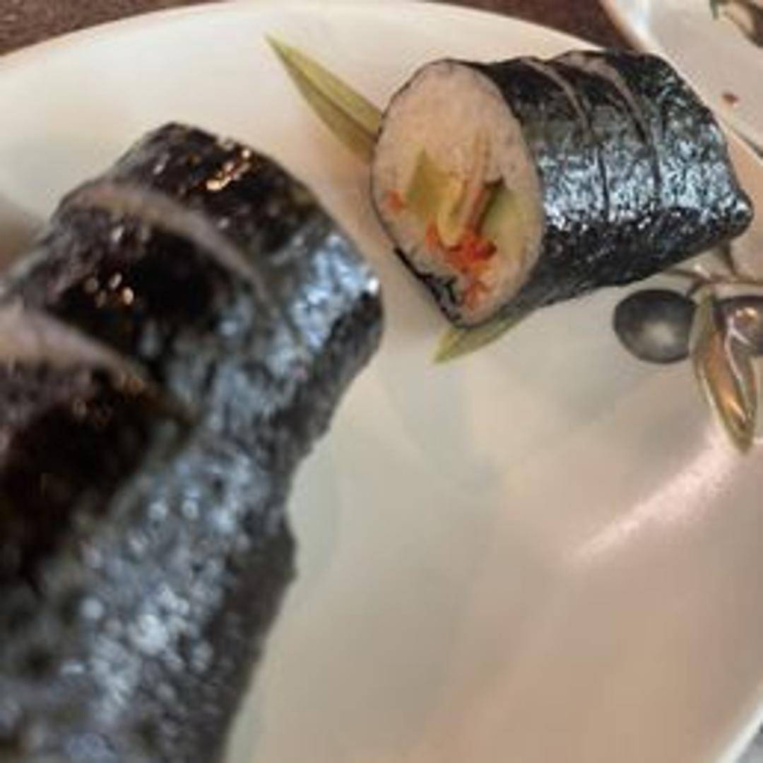 Korean seaweed rice rolls filled with cooked rice, vegetables, pickled radish, egg, and protein (such as bulgogi, tuna, or ham). Sliced into bite-sized pieces.