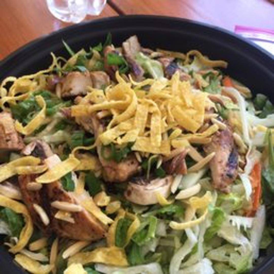 A vibrant and flavorful salad featuring tender grilled chicken breast, crisp mixed greens, crunchy rice noodles, fresh mandarin oranges, toasted almonds, and a savory sesame ginger dressing.
