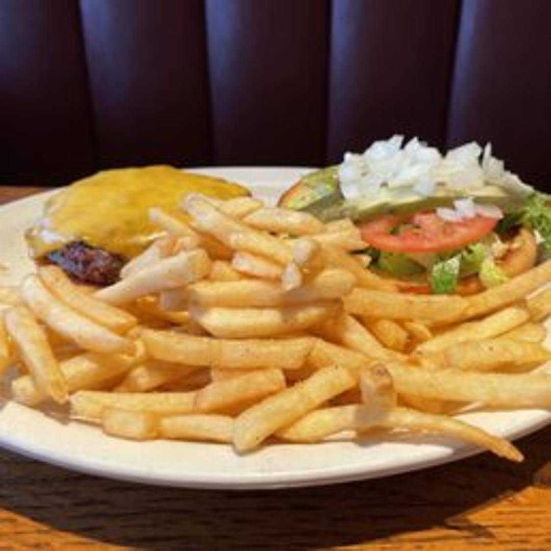 Juicy Angus beef patty on a toasted bun with lettuce, tomato, onion, and your choice of cheese. Served with fries.