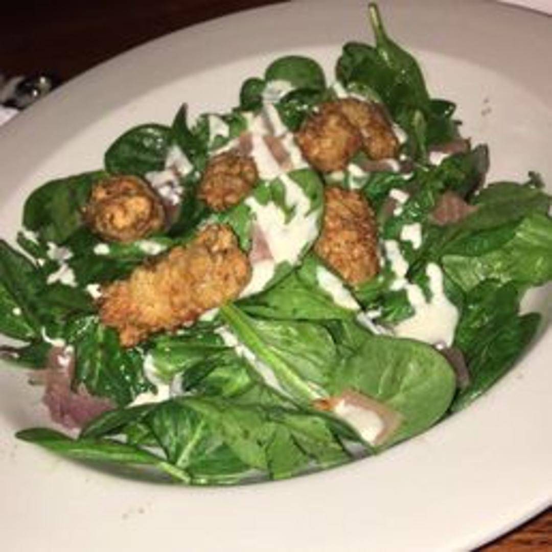 Fresh, succulent oysters tossed with crisp greens, celery, and a creamy, tangy dressing. Garnished with herbs.