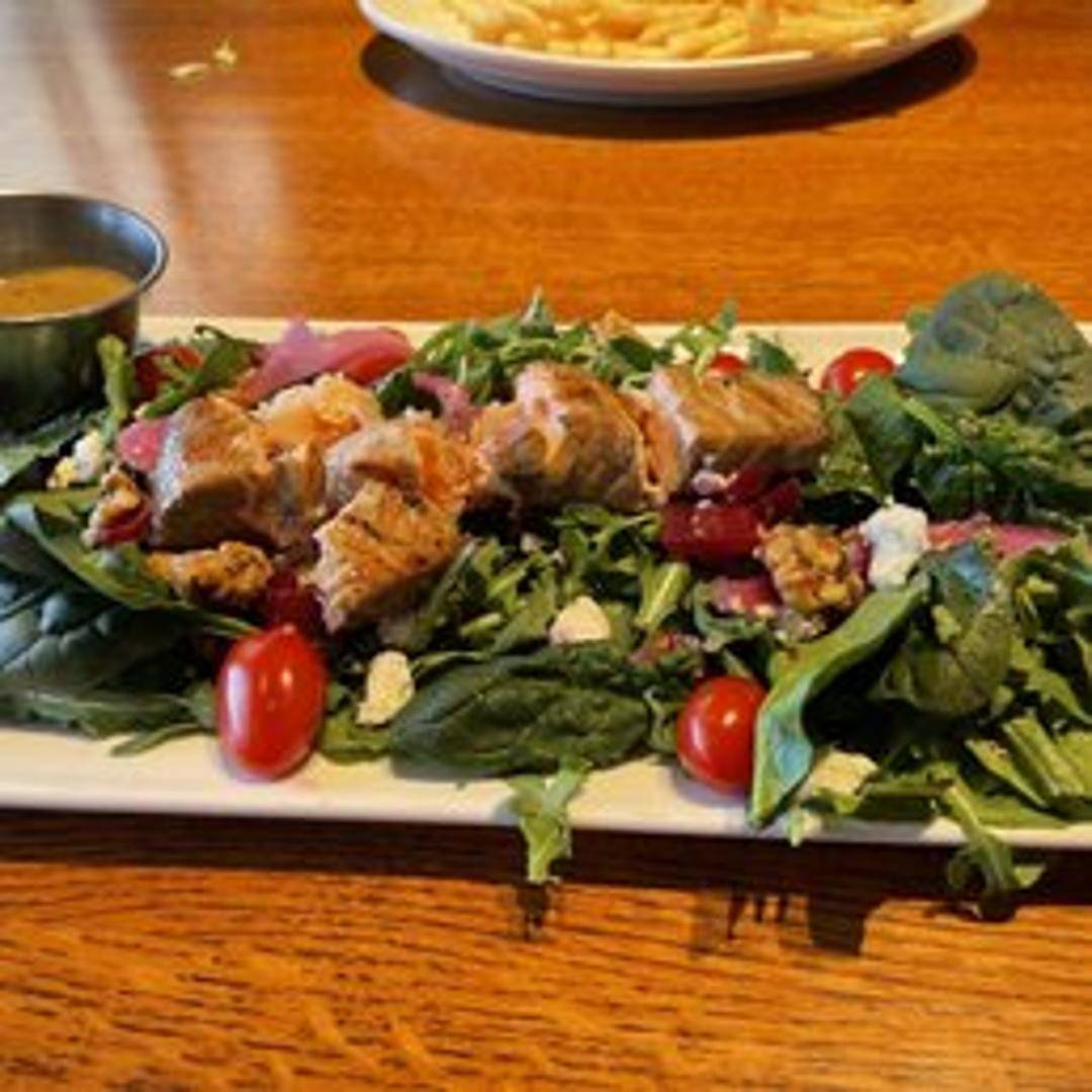 Freshly grilled salmon fillet served atop a bed of mixed greens with seasonal vegetables, and a choice of house-made dressing. May contain ingredients like tomatoes, cucumbers, red onion, avocado and croutons.