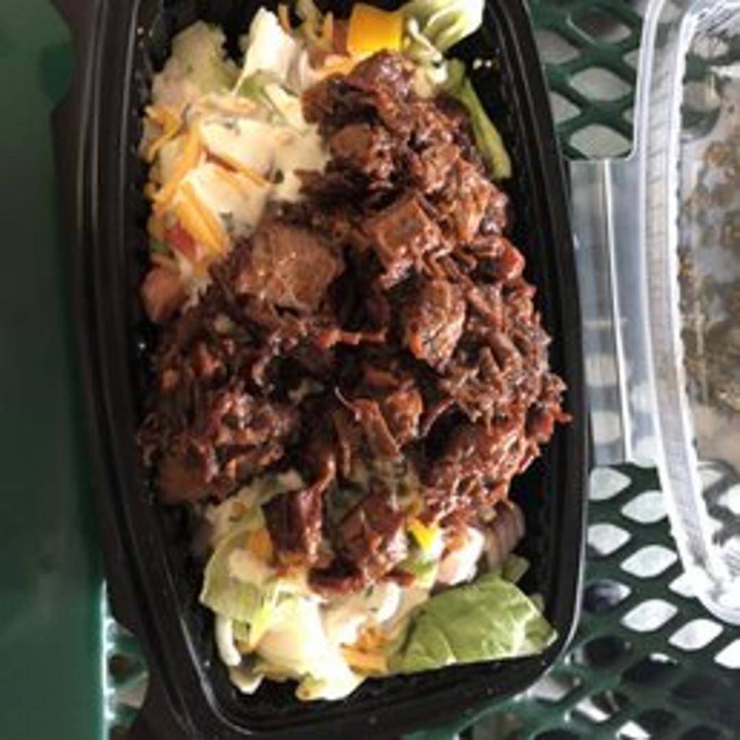 A flavorful salad featuring tender, smoky burnt ends of beef, combined with fresh greens, vegetables (such as tomatoes, cucumbers, and red onion), and a tangy BBQ-inspired dressing. A hearty and satisfying salad option with a distinctly smoky BBQ flavor.