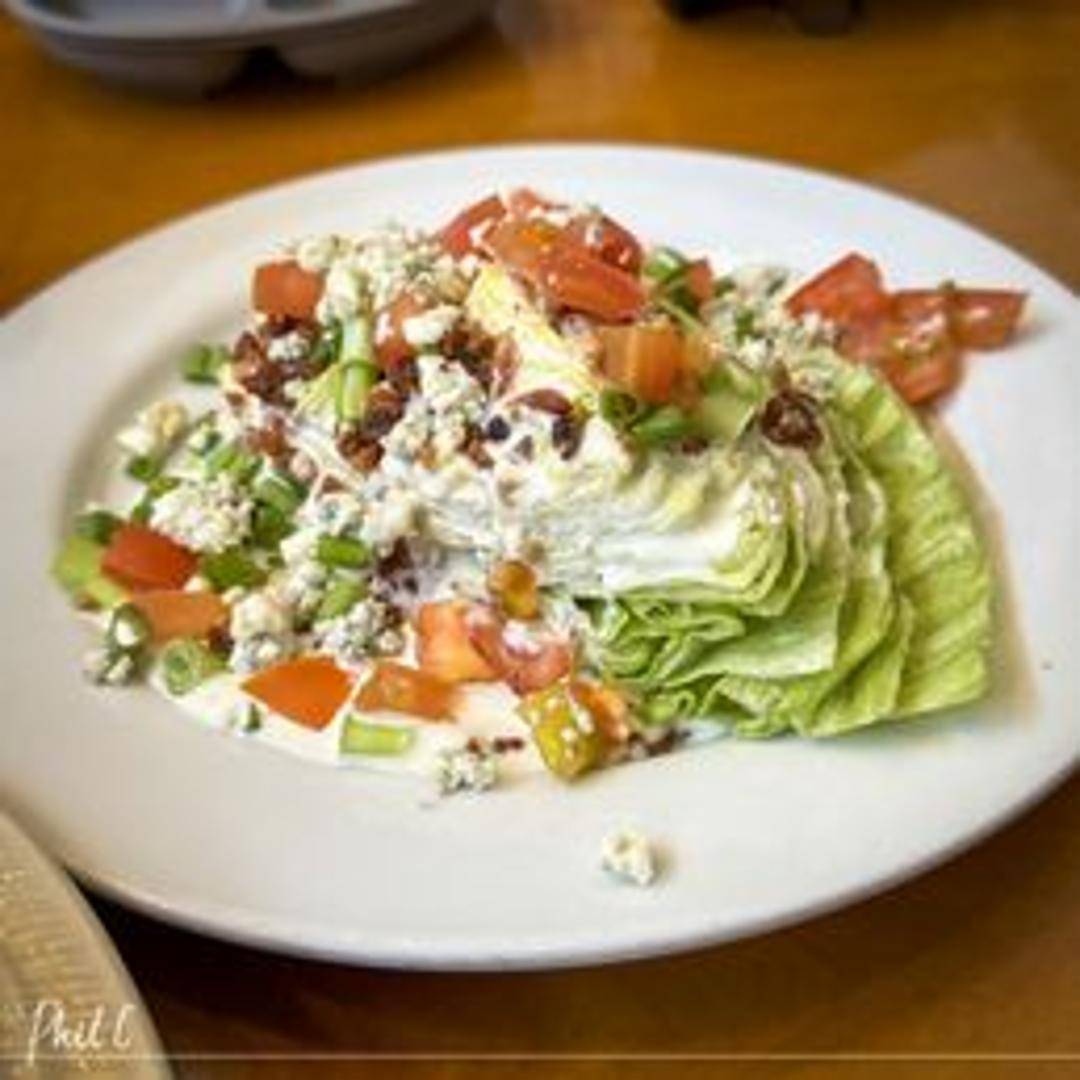 A crisp wedge of iceberg lettuce, topped with creamy blue cheese dressing, crumbled bacon, diced tomatoes, and a sprinkle of red onion. A classic and refreshing salad.