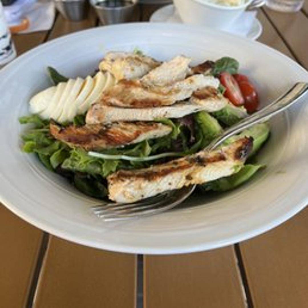 A perfectly grilled, tender, and juicy chicken breast, nestled between two slices of a toasted artisan bun. This classic sandwich is typically adorned with crisp lettuce, ripe tomato, and a savory sauce, offering a delightful combination of fresh flavors and satisfying textures in every bite.