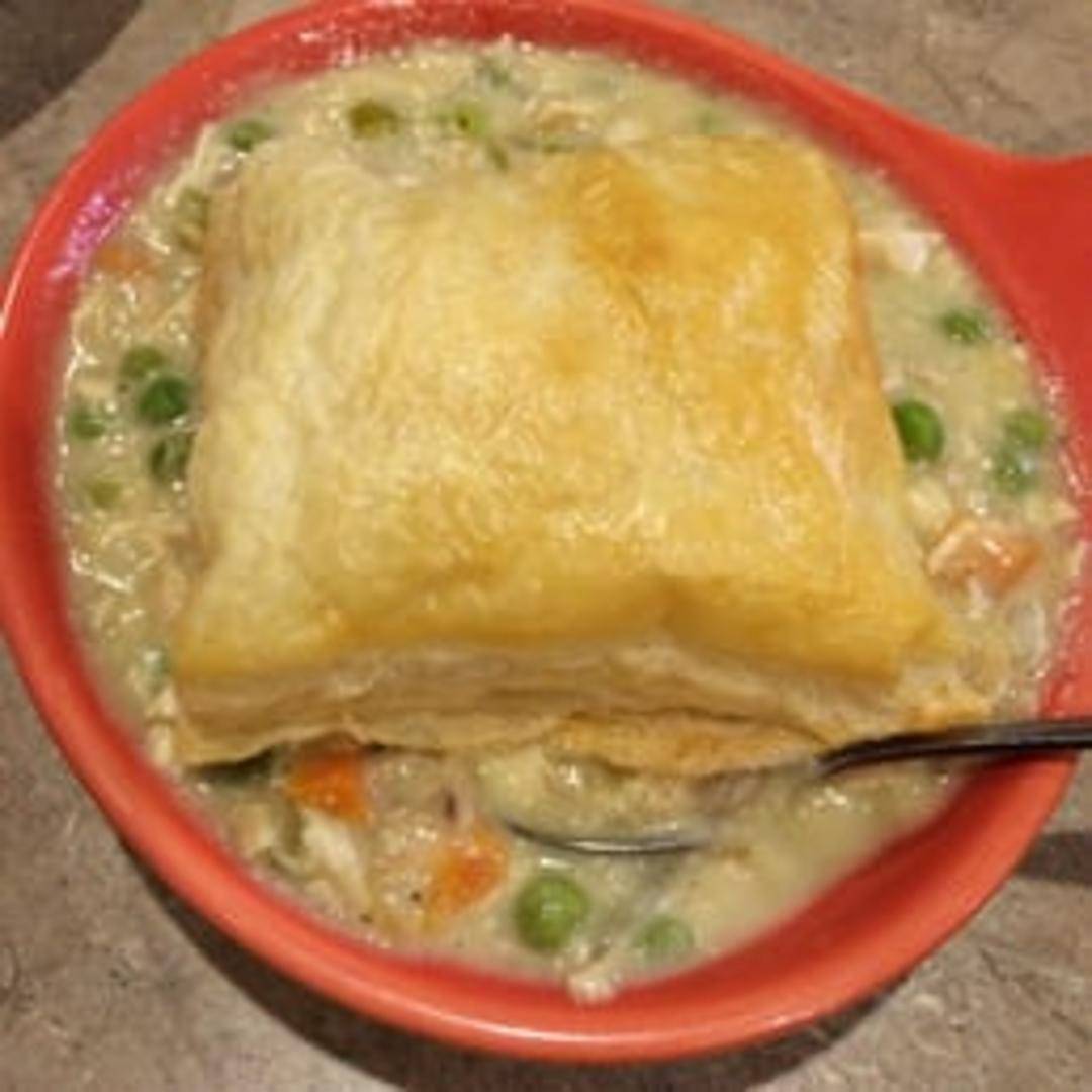 A savory and comforting pot pie filled with tender chunks of chicken, mixed vegetables (peas, carrots, potatoes, etc.), and a creamy, flavorful sauce, all encased in a flaky, golden-brown crust. Availability may vary depending on the season.