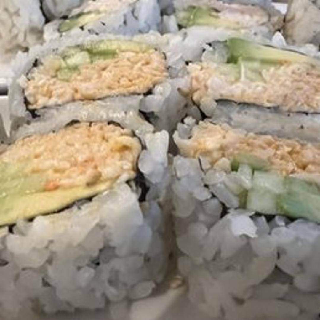 A classic sushi roll featuring imitation crab meat, avocado, and cucumber, rolled in seasoned sushi rice and nori seaweed.