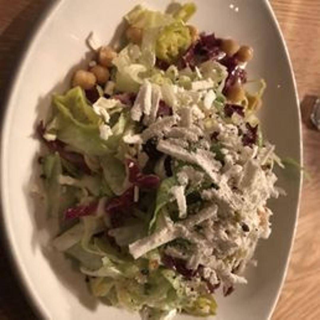 Harvest Bar + Kitchen's signature chopped salad, a vibrant and refreshing mix of crisp seasonal greens, finely diced fresh vegetables, and savory additions, all tossed in our delicious house dressing for a perfectly balanced and satisfying experience.