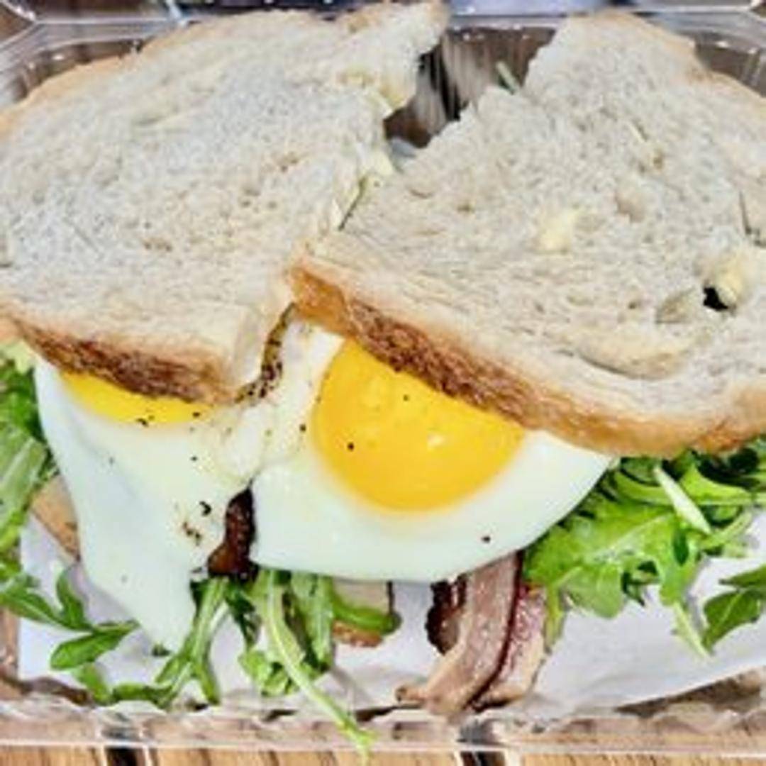 An Italian breakfast inspired sandwich built with prosciutto, fried egg, fontina cheese, and a drizzle of truffle oil on toasted sourdough.