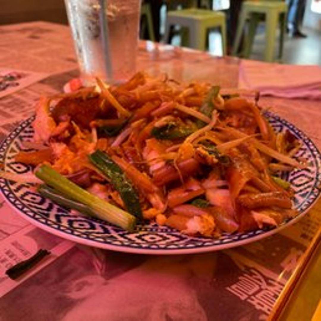 A popular stir-fried noodle dish featuring flat rice noodles, succulent shrimp, Chinese sausage, cockles, bean sprouts, and chives, all tossed in a savory-sweet soy sauce based sauce with a hint of chili. Wok-hei, the breath of the wok, imparts a distinct smoky flavor to this classic Malaysian street food.
