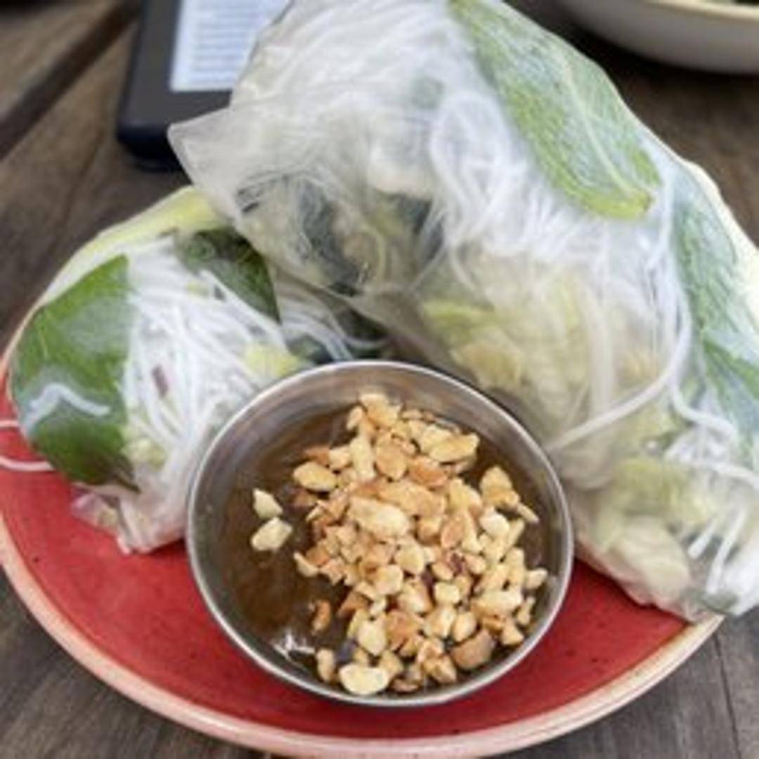 Fresh rice paper rolls filled with vermicelli noodles, shrimp, lettuce, herbs, and a peanut dipping sauce.