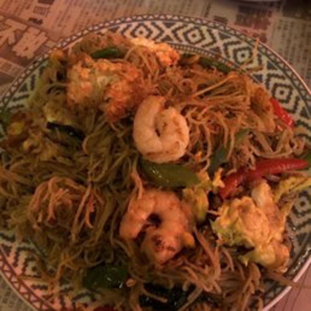 Thin rice noodles stir-fried with shrimp, chicken, pork, vegetables, and curry powder.