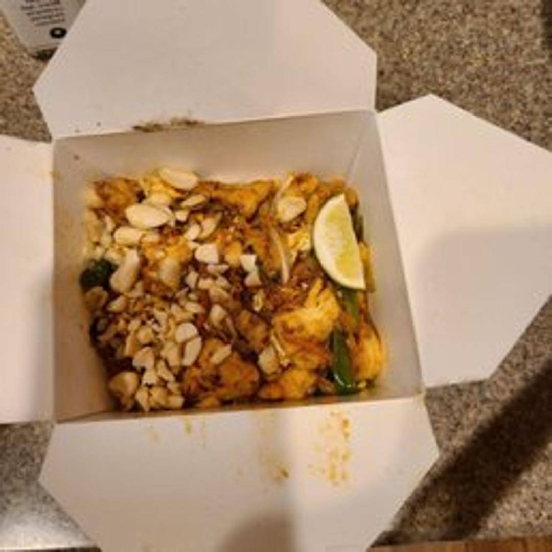 Thailand's most famous noodle dish! Rice noodles stir-fried with shrimp, tofu, bean sprouts, scallions, and egg in a sweet-and-savory tamarind sauce. Garnished with crushed peanuts and a lime wedge.