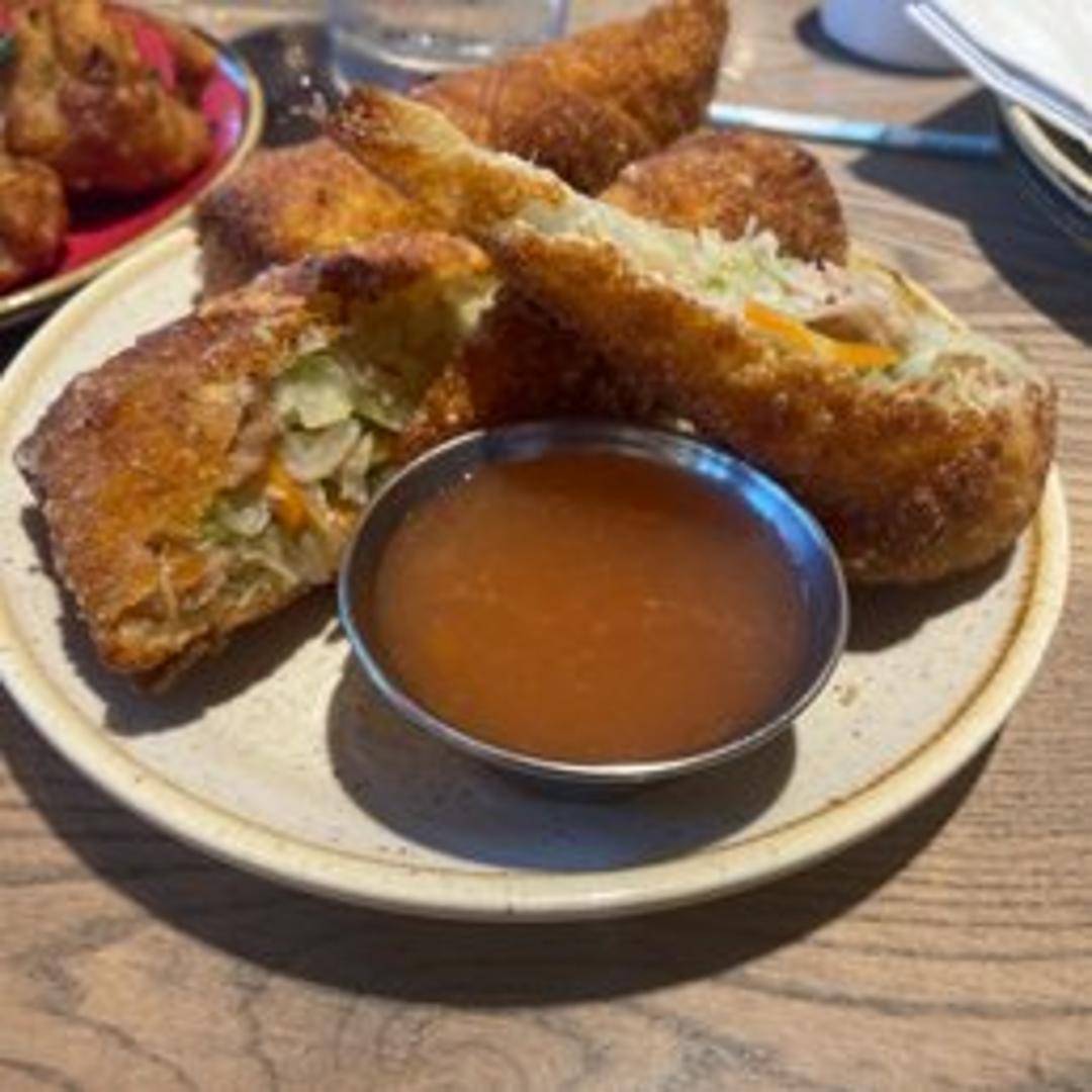Two crispy, deep-fried egg rolls filled with shredded chicken, cabbage, carrots, and other vegetables. Served with a side of sweet chili dipping sauce.
