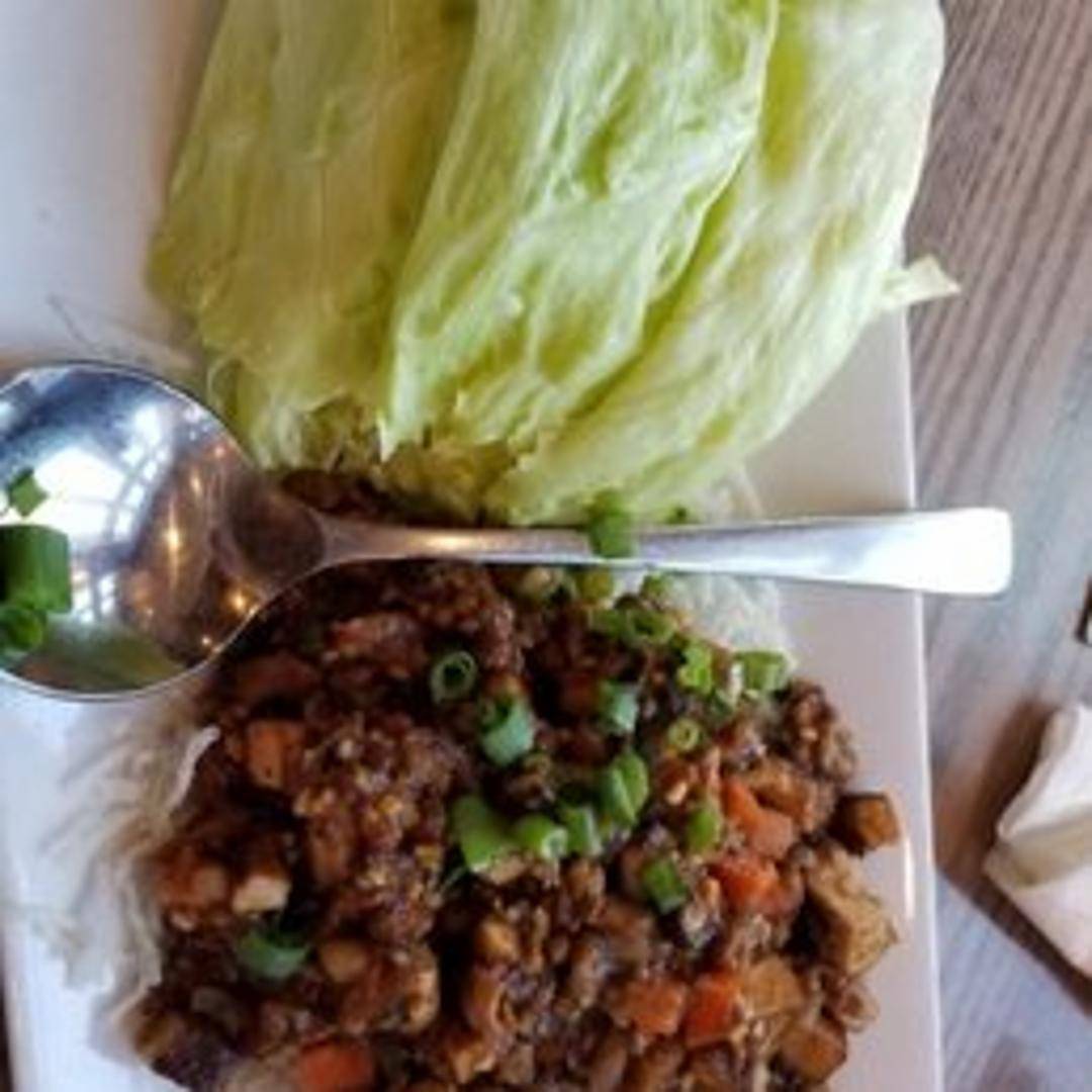 Savory stir-fried filling, typically a flavorful combination of ground meat (often chicken or pork), water chestnuts, mushrooms, and aromatic vegetables, served with crisp lettuce cups for wrapping. Garnished with crispy noodles and a side of hoisin sauce.