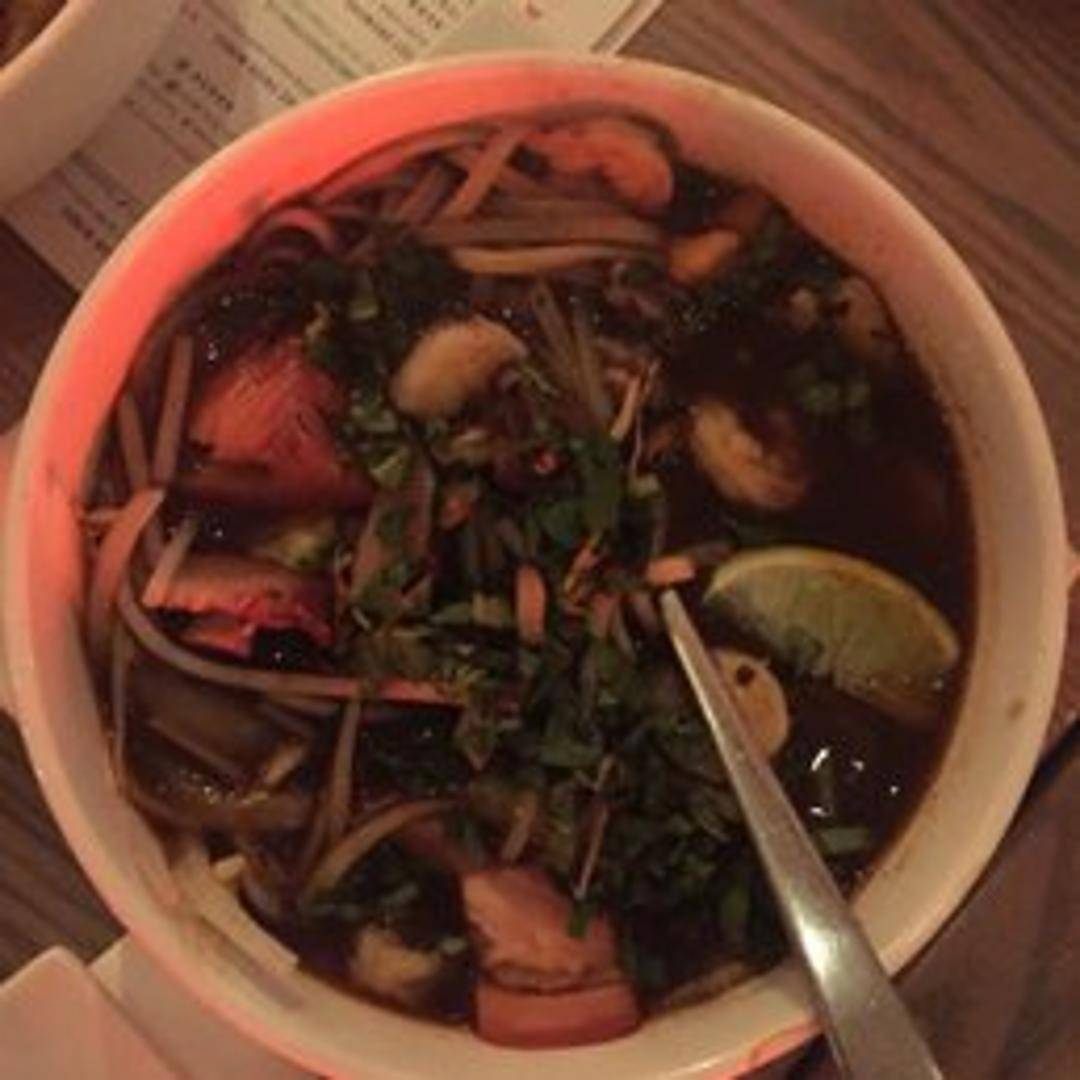 A hot and sour soup with lemongrass, galangal, kaffir lime leaves, mushrooms, tomatoes, and your choice of protein (chicken, shrimp, or tofu).