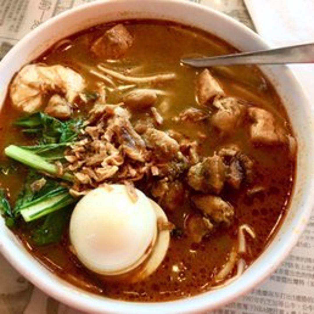 A rich and creamy coconut curry noodle soup with shrimp, chicken, tofu puffs, bean sprouts, and hard-boiled egg. Garnished with fried shallots and fresh herbs.