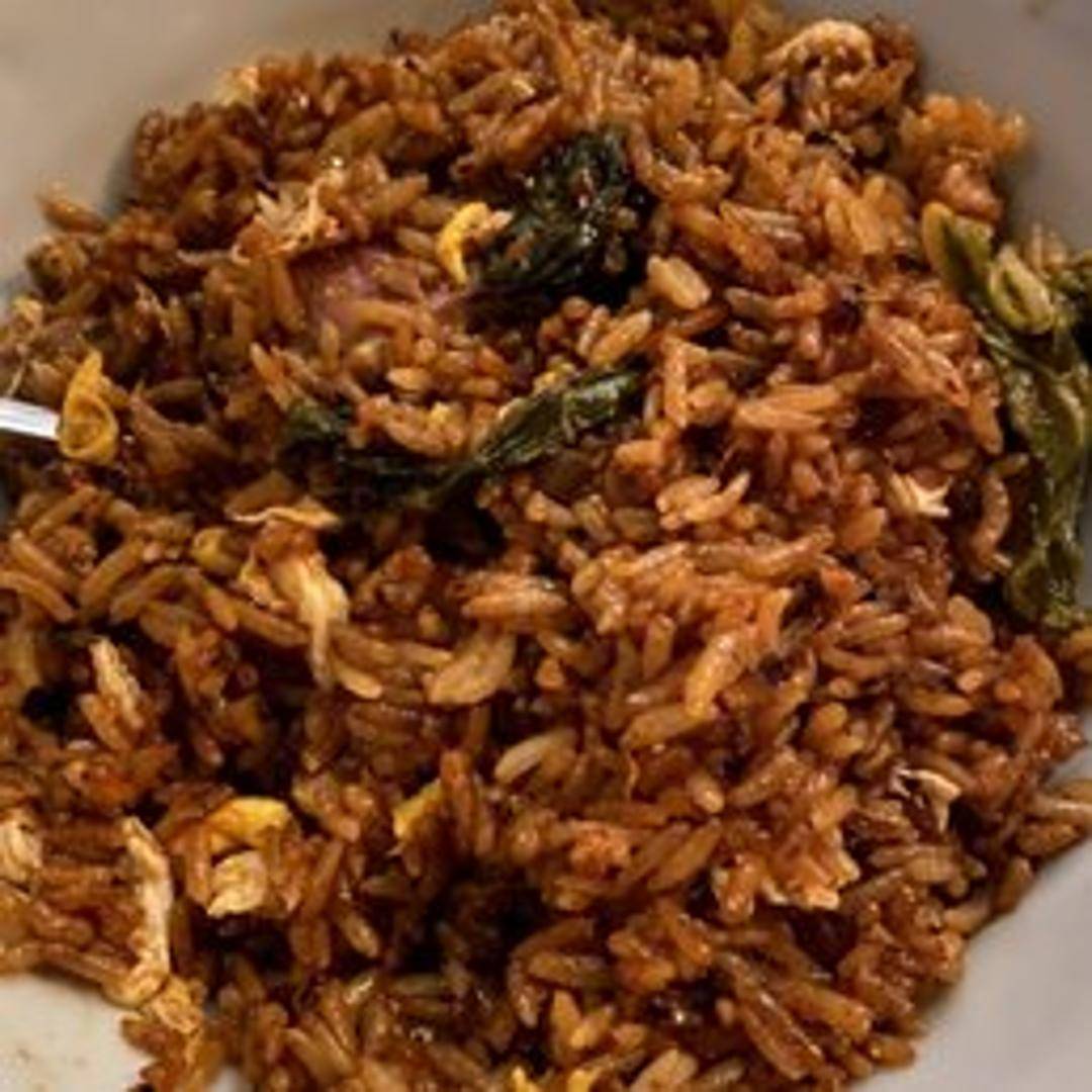 Spicy and flavorful fried rice featuring kimchi, gochujang paste, and topped with a fried egg. Contains rice, kimchi, vegetables, and Korean chili paste.