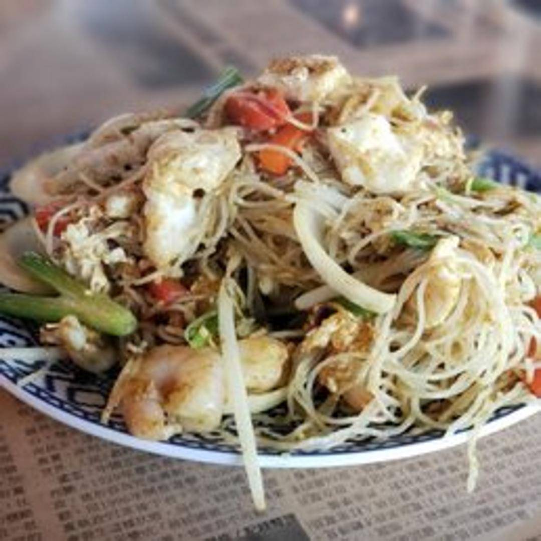 Thin rice noodles stir-fried with shrimp, chicken, egg, bean sprouts, onions, and bell peppers in a yellow curry powder seasoned sauce.