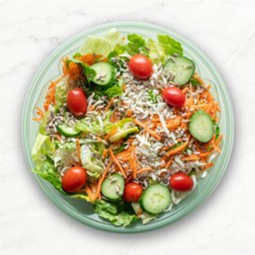A substantial and customizable salad featuring a variety of fresh ingredients. Likely includes a base of mixed greens, along with a selection of toppings such as vegetables, cheeses, nuts, seeds, and protein options (e.g., chicken, turkey, tofu). Dressings are typically offered on the side. Contact Health Nut for a current list of available toppings and dressing options.