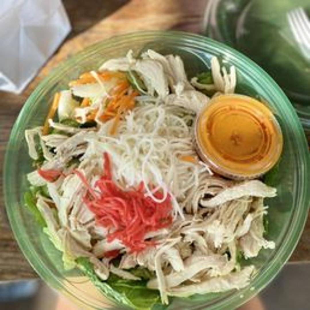 A vibrant salad featuring noodles, mixed greens, shredded carrots, sesame seeds, and a light vinaigrette dressing. (Note: May or may not include tuna, depending on customization.)