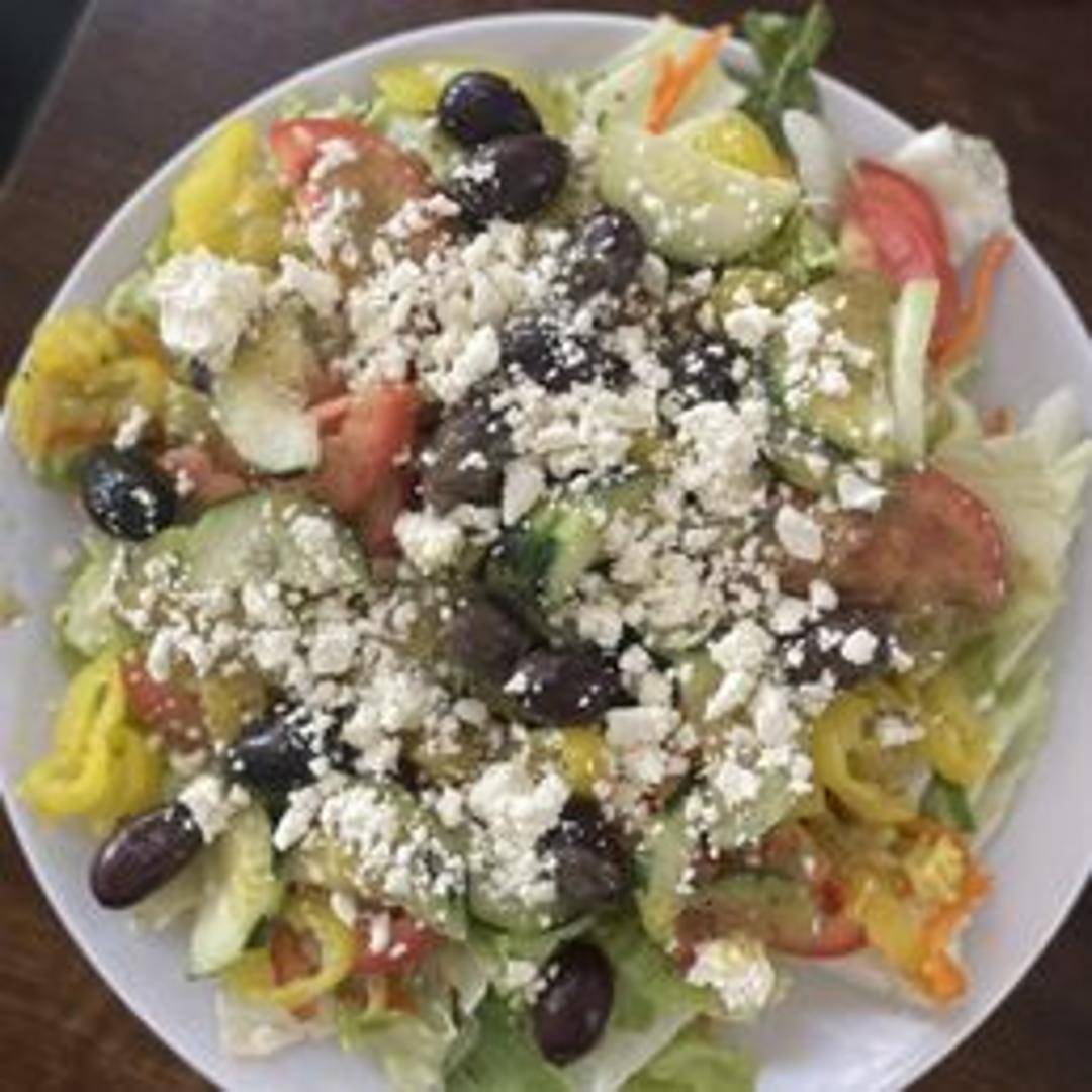 A refreshing salad with romaine lettuce, tomatoes, cucumbers, onions, Kalamata olives, feta cheese, and a Greek vinaigrette dressing.