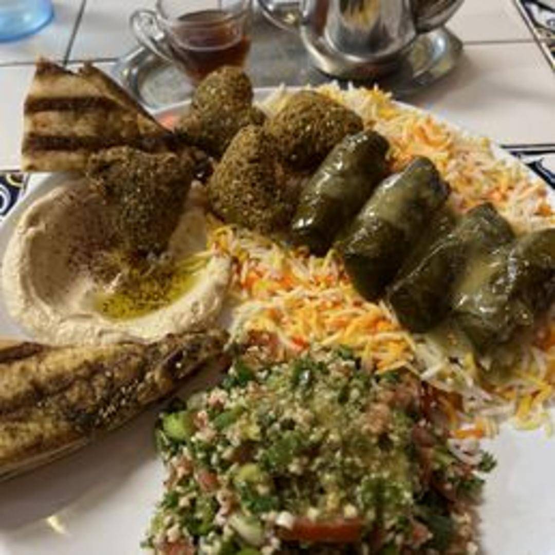 A colorful and flavorful plate featuring hummus, baba ghanoush, Israeli salad, grape leaves, and pita bread.