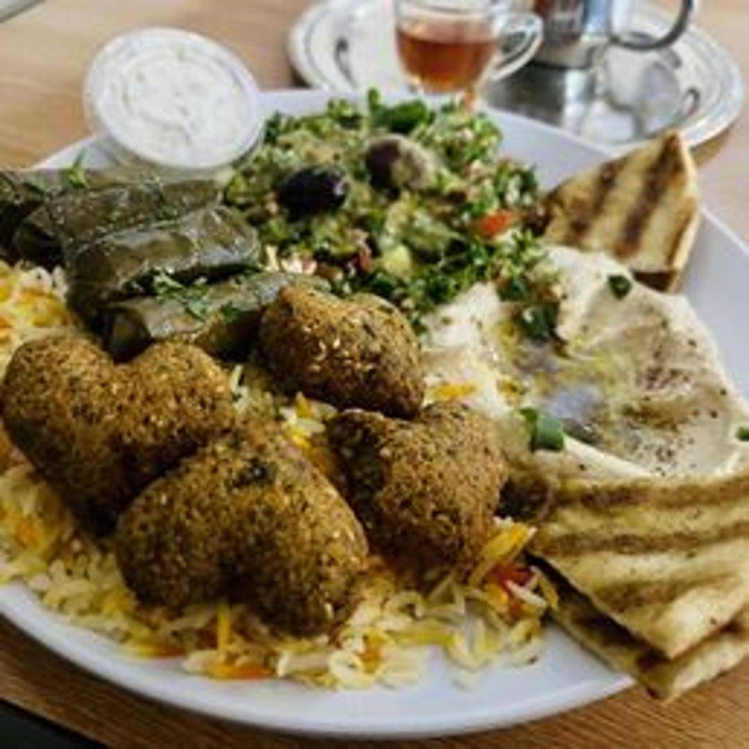 A colorful and flavorful assortment of vegetarian delights, including hummus, Israeli salad, baba ghanoush, falafel, pickled vegetables, and warm pita bread. Perfect for sharing or enjoying as a complete meal.