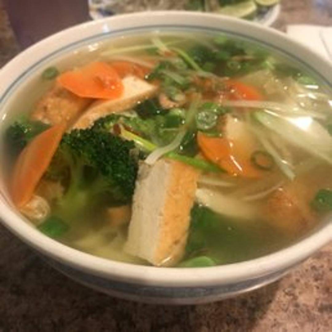 A flavorful and aromatic vegetarian noodle soup featuring a vegetable-based broth simmered with fragrant spices. Served with rice noodles, a variety of fresh vegetables (such as mushrooms, tofu, carrots, and bok choy), and topped with fresh herbs (cilantro, basil, and mint), bean sprouts, and lime wedges. Offered with soy sauce or vegetarian fish sauce as a flavorful alternative.