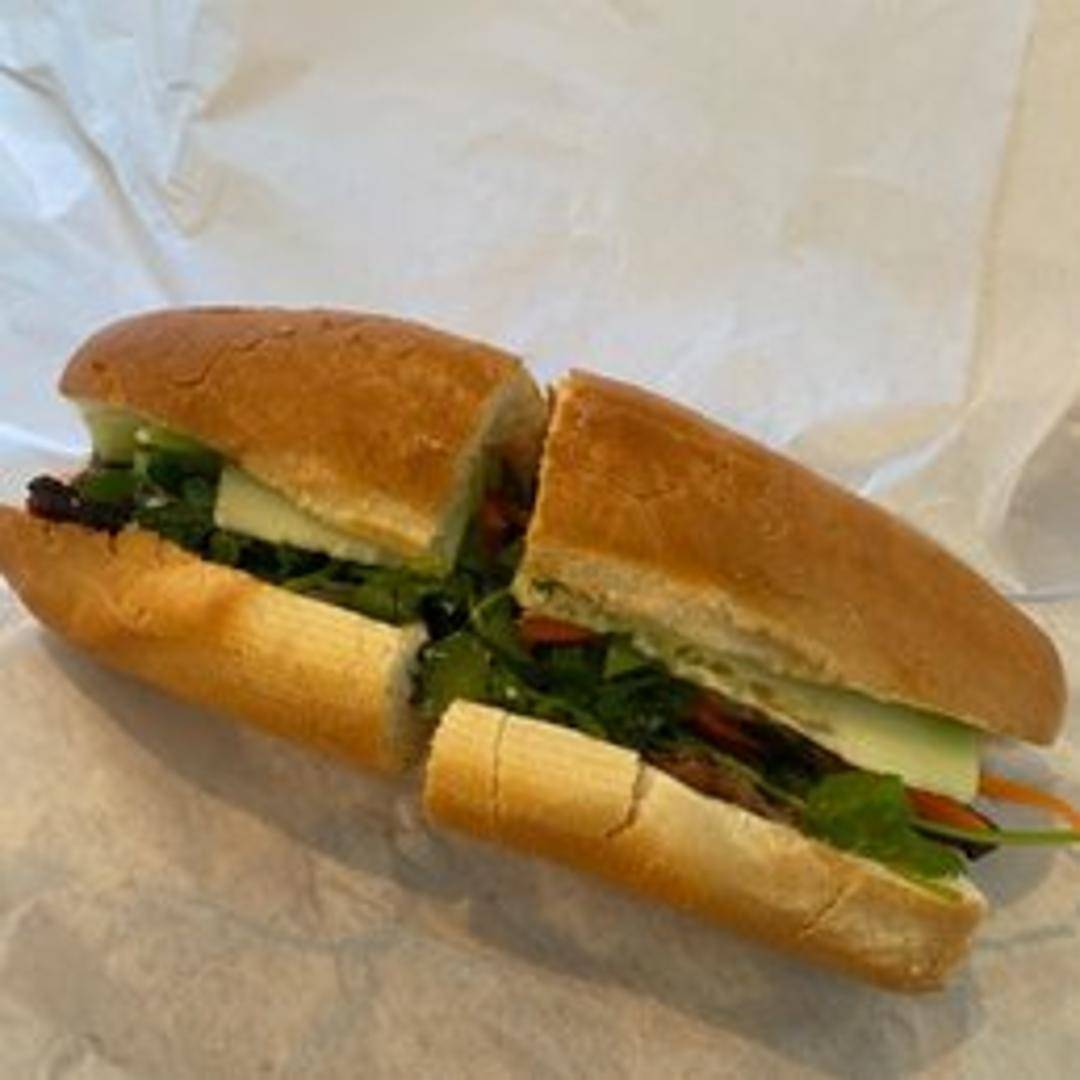 A Vietnamese sandwich served on a toasted baguette, filled with your choice of protein, pickled carrots and daikon radish, fresh cilantro, sliced cucumber, jalapeños (optional), and a smear of flavorful mayonnaise.