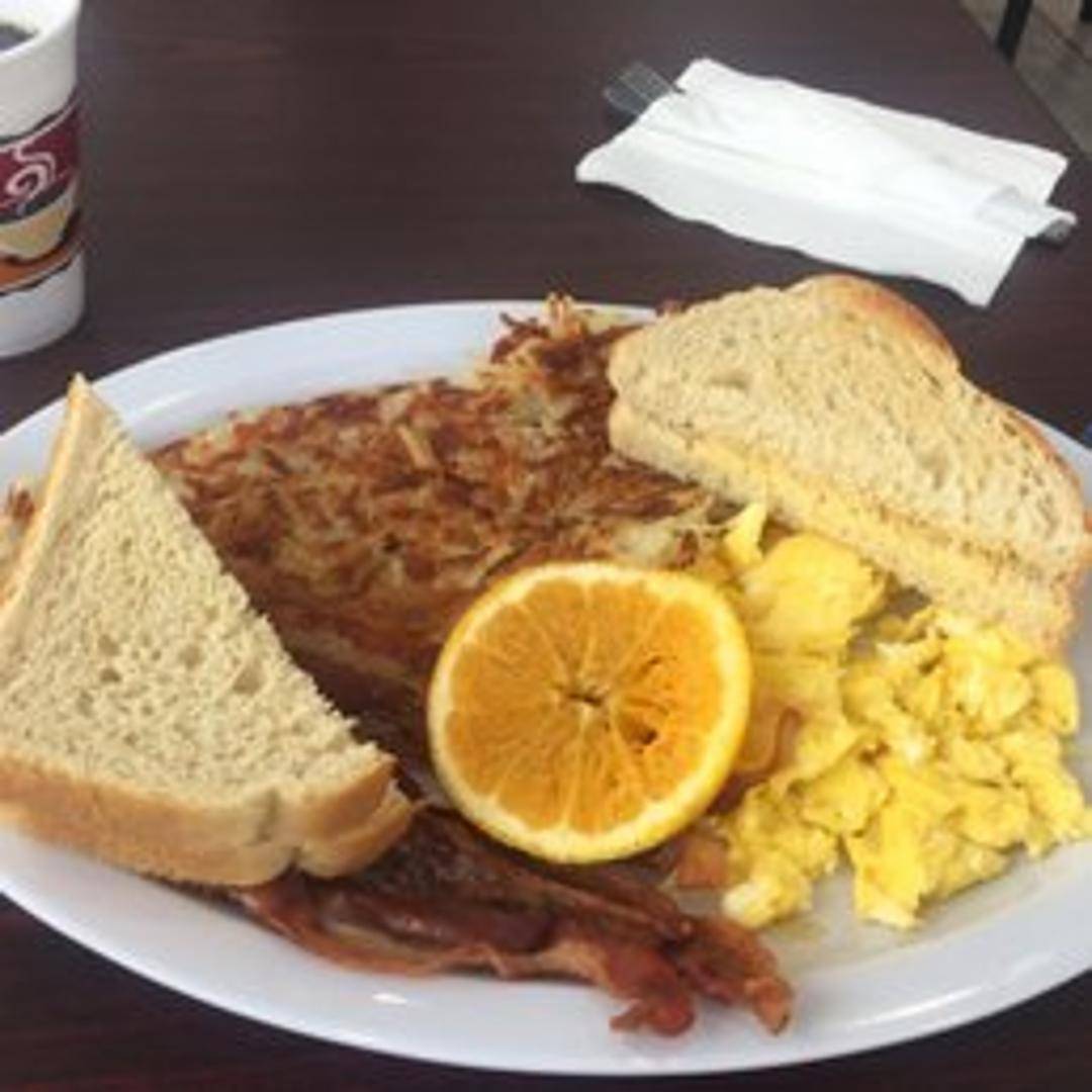A warm flour tortilla filled with scrambled eggs, crispy bacon, shredded cheese, and your choice of potatoes or hashbrowns.