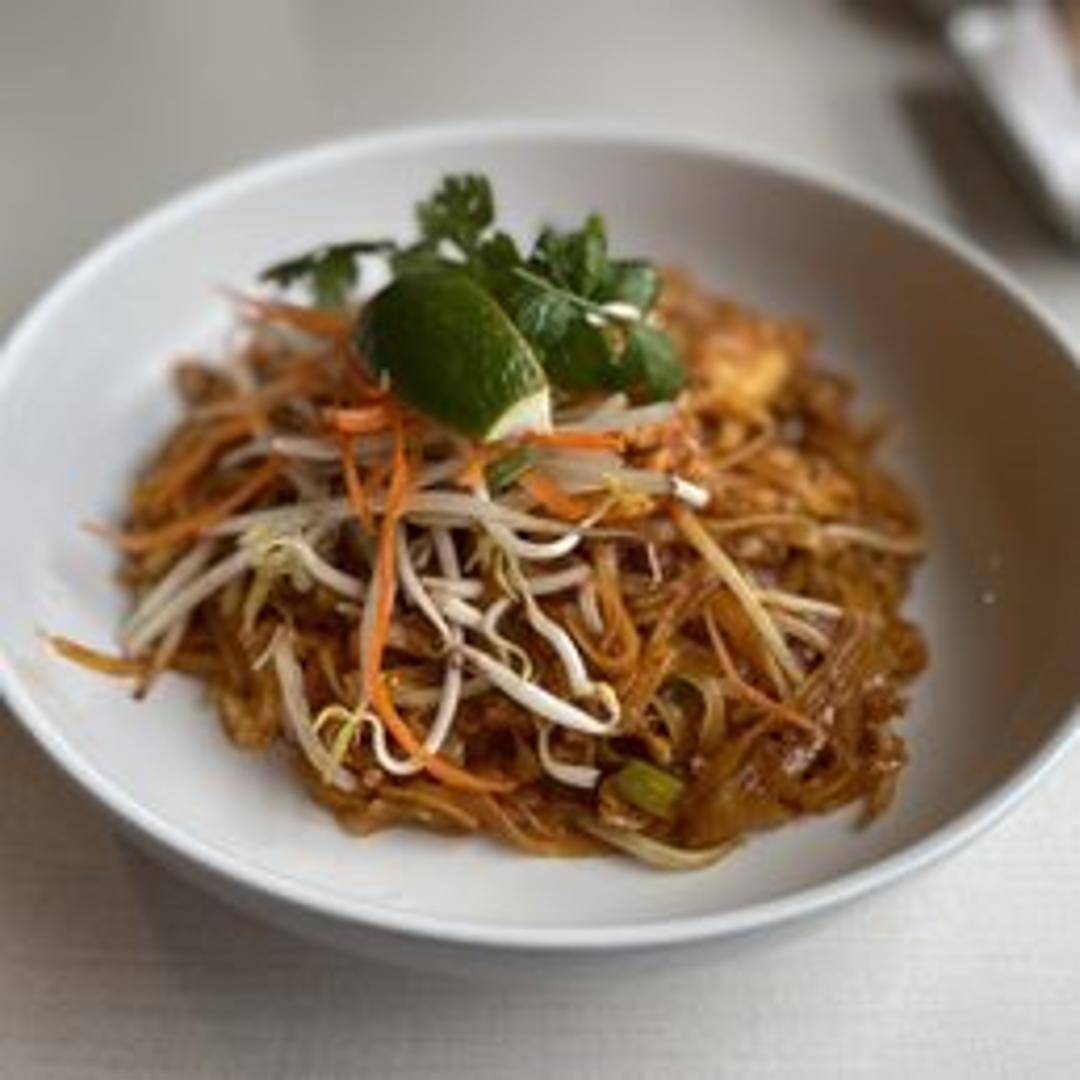 Thailand's most famous noodle dish! Rice noodles stir-fried with your choice of protein, egg, bean sprouts, peanuts, and a tangy tamarind sauce. Garnished with lime.